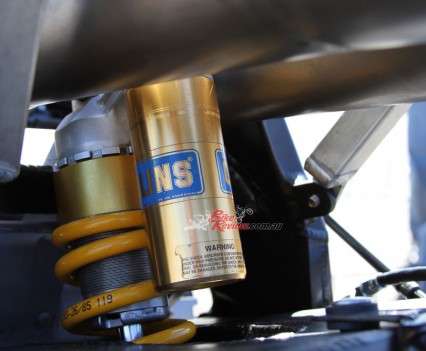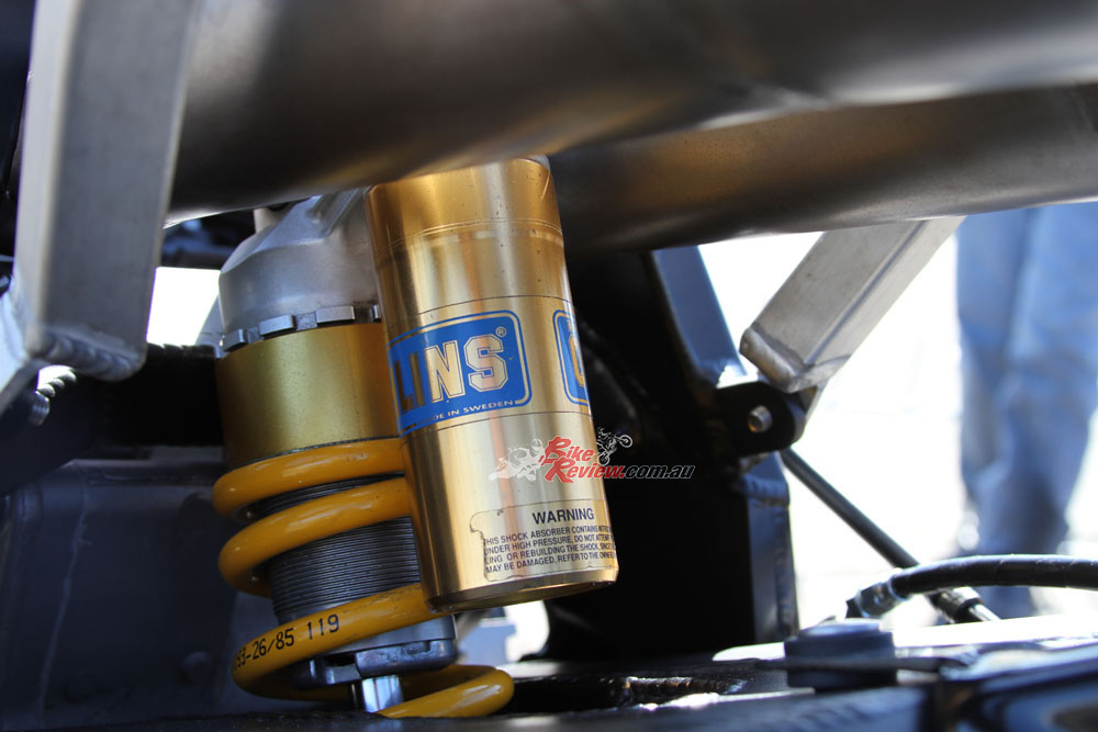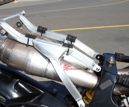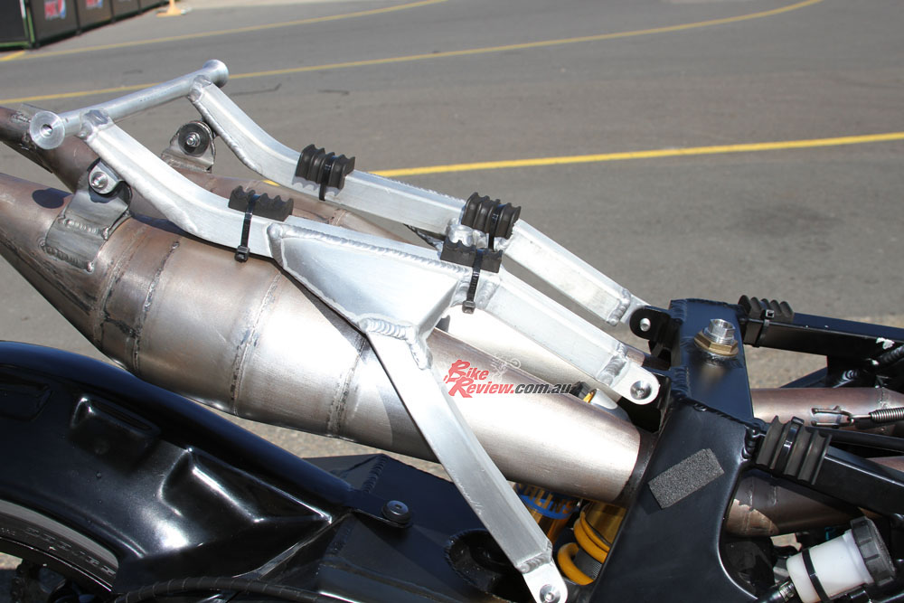 The shock is a genuine era Ohlins Grand Prix factory unit, while the Costin Engineering pipes were hand made from mild steel just like the ones Rainey ran in 1990. The mufflers are genuine YZR500.