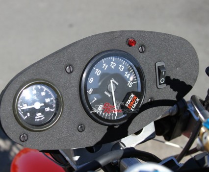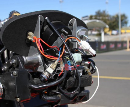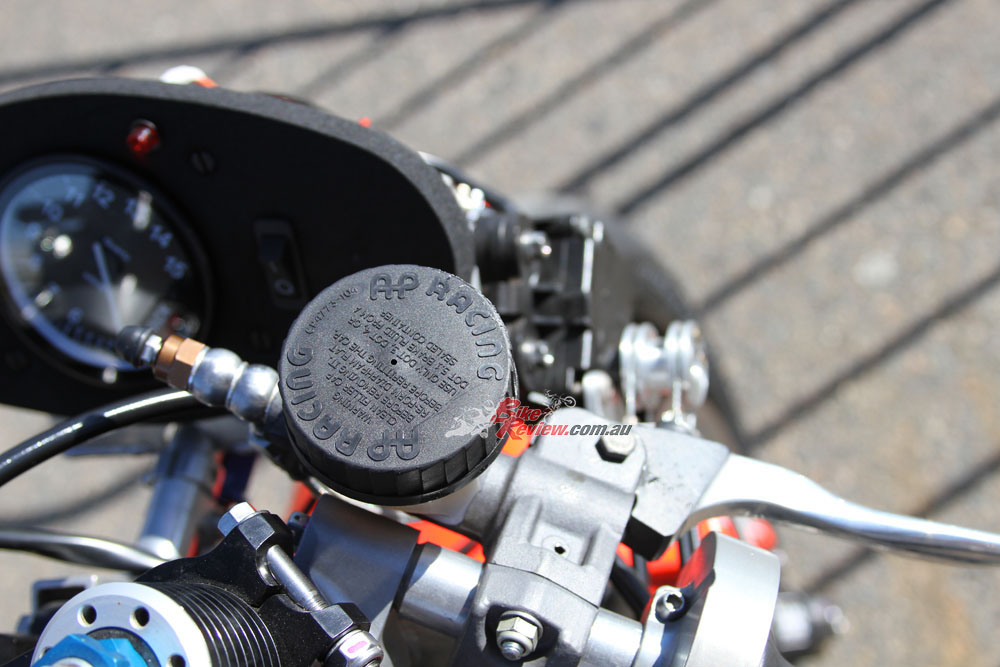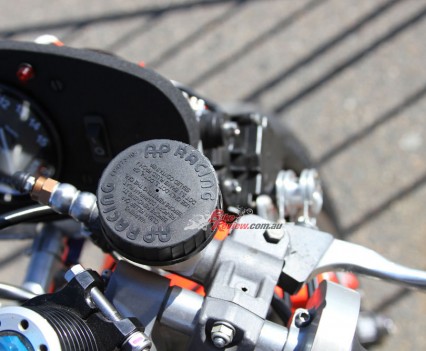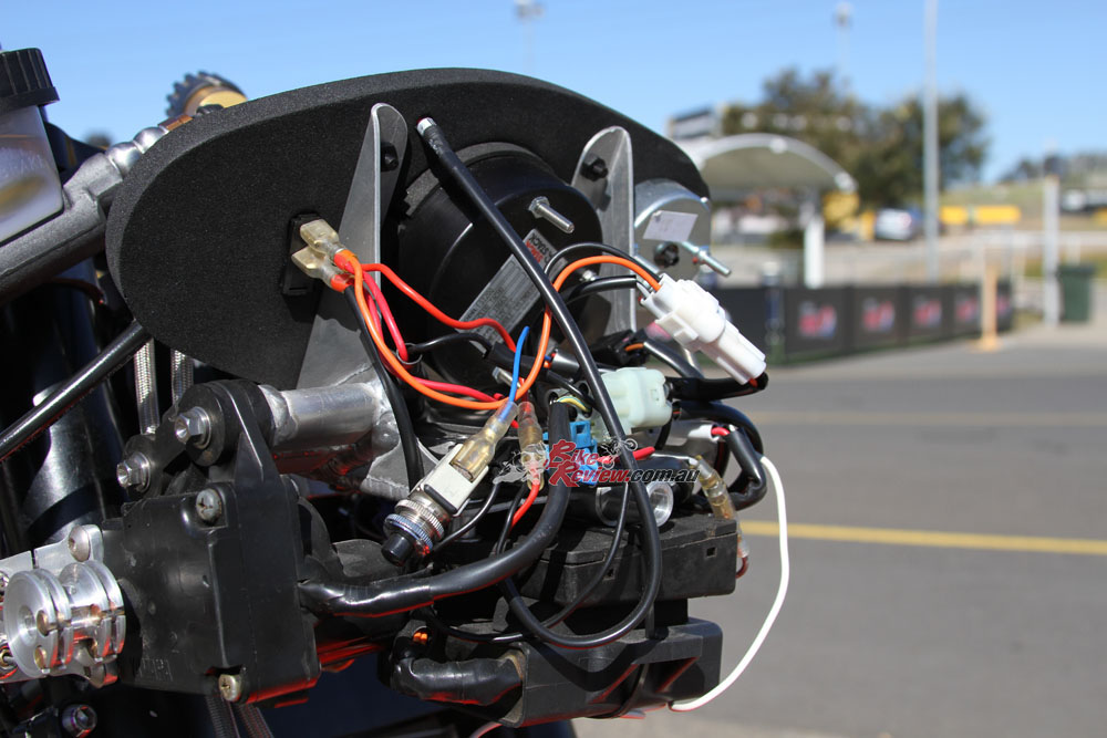 The ignition system is a Costin GP plug-in race system with adjustable ignition curve and power-valve controller. All electrical components are mounted up front as per the real bike.