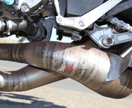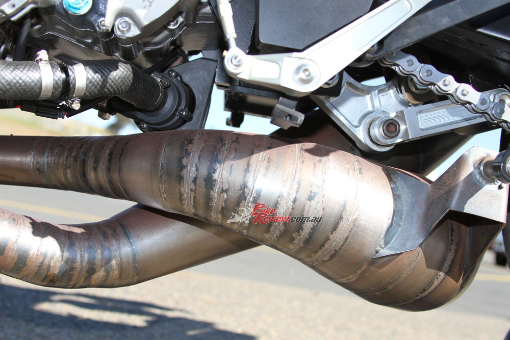 In 1990 Rainey’s bike ran steel expansion chambers for most of the season, aside from a few races at the end where titanium items were used only for the top two pipes. In keeping with the original, Costin made four steel expansion chambers, which are stunning. They all have original YZR500 mufflers.