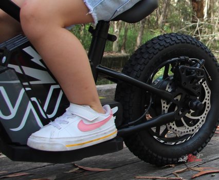 The forks allow improved handling and feel as well as cushioning to improve the overall comfort of the ride over rough terrain. This is important because depending on the throttle setting, your little ones could be zooming at up to 29km/h on the 16in and 19km/h on the 12in.