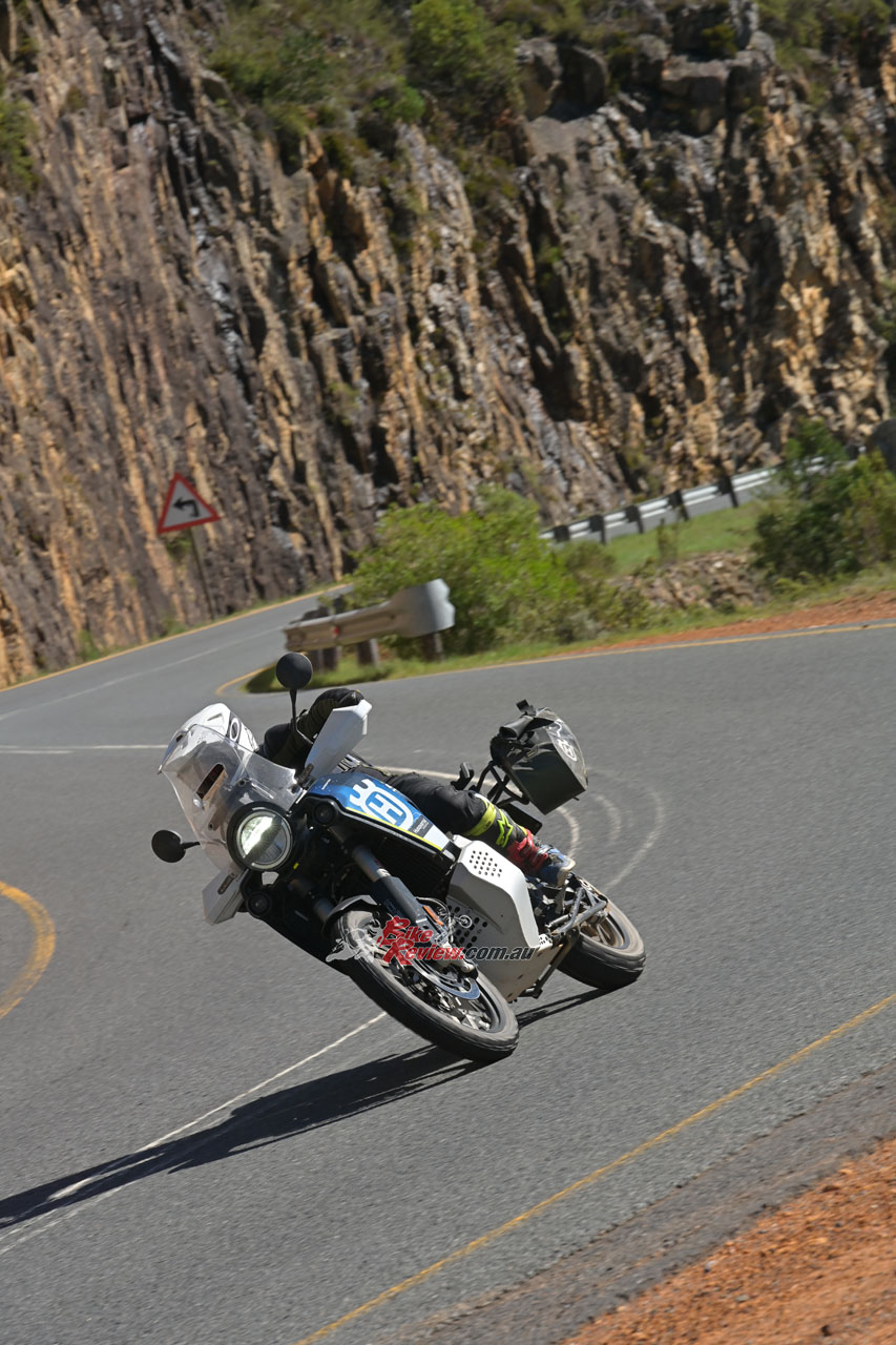 In Street mode, jump on, and ride – it’s that simple. The 889cc parallel twin is hugely versatile, pulling cleanly from low in the rpm thanks to a helpful spread of torque, or lofting the front wheel at will in the first two gears as the numbers build on the tacho. On a private section of South African road, the Expedition reaches an indicated 200km/h without fuss and is happy to cruise at high speeds – and, yes, cruise control comes as standard.