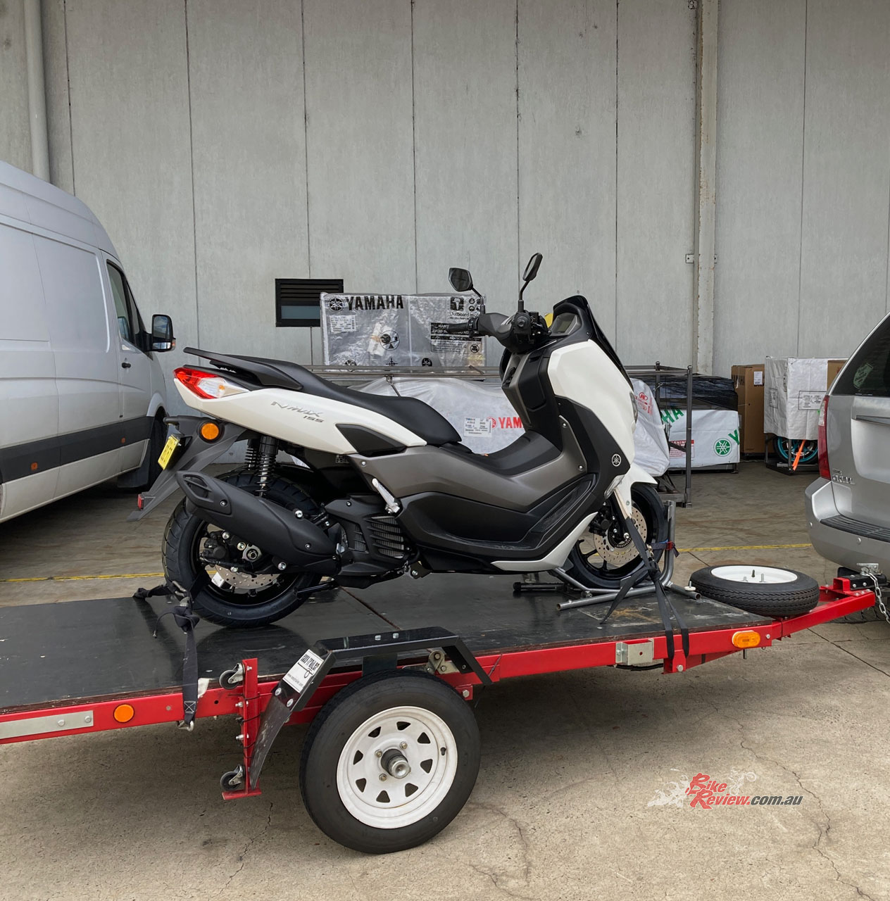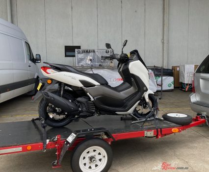 I had to have another surgery in January, then three months in a cast and splint for my right hand, so I was keen to do the scooter thing again, and this time Yamaha suggested an NMAX 155, so I can ride as far as Sydney from the Central Coast, as it does highway speeds. I picked the brand new Milky White NMAX 155 up late March, with 0km on the dial, and trailered it back to BikeReview HQ.
